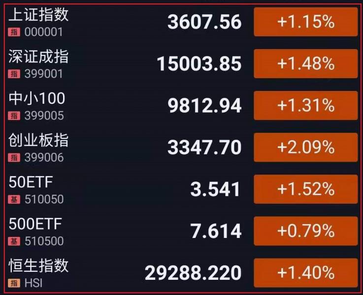 今天上午有些拉指数跌中小盘股走势,下午中小盘股也被带起来,总的来看今天全面走强。除了上证50底部还有反复,其他几个5个指数上行趋势已经很明确了,后市还会反复震荡拉升。