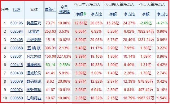 今日沪深两市主力资金净流入排名前5的个股分别为:复星医药、比亚迪、四维图新、五 粮 液、N力芯微;主力资金净流出排名前5的个股分别为:三峡能源、华天科技、财达证券、招商银行、隆基股份。