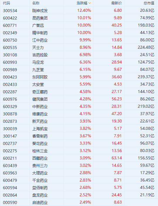 中药板块异动拉升,广誉远、昆药集团、精华制药、江中药业涨停,陇神戎发涨超12%,天士力涨近9%,吉药控股、九芝堂、马应龙涨超6%,东阿阿胶、奇正藏药、中新药业等纷纷跟涨。国家将完善发展环境,支持国家中医药服务出口基地发展,大力推动中医药服务贸易,助力中医药服务国际化,中药龙头企业有望迎来历史性发展机遇。