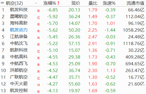 航空装备板块快速走低,航发科技跌6.8%,海特高新、航发动力、中航沈飞等多股跌逾5%。