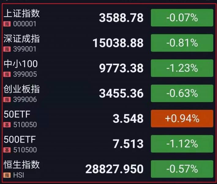 1.三大指数集体高开,开盘后维持震荡态势。午后指数触底回升,集体翻红,沪指重回3600点,创业板指一度站上3500点,为2015年6月以来首次。临近尾盘,指数冲高回落,三大指数全部翻绿,沪深两市成交额突破1万亿元。板块方面,华为鸿蒙概念走低,军工板块持续下行。总体而言,多空博弈激烈,市场情绪较热,个股跌多涨少,赚钱效应一般。截至收盘,上证指数跌0.07%,报3588.78点,深证成指跌0.81%,报15038.88点,创业板指跌0.63%,报3455.36点;