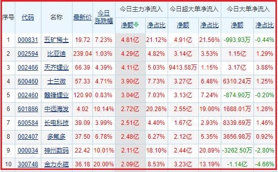 今日沪深两市主力资金净流入排名前5的个股分别为:五矿稀土、比亚迪、天齐锂业、士兰微、赣锋锂业;主力资金净流出排名前5的个股分别为:东方财富、三一重工、中国平安、五 粮 液、中国中免。