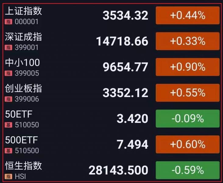 1.A股三大指数集体低开,盐湖提锂、锂电池概念掀涨停潮,银行、养殖板块下挫走弱。盘中指数宽幅震荡,稀土、有色加工拉升走强,大豆、玉米等农业股回暖;中药、医药电商大幅走弱,采掘服务、机场航运表现低迷。午后,指数延续盘整,煤化工、服装家纺、第三代半导体短线走高,华为海思概念、鸿蒙概念表现活跃;食品、饮料等大消费板块下挫。总体来看,三大指数均出现明显的黄白线背离,个股表现两极分化,两市逾3000个股上涨,权重股回调拖累指数。截至收盘,上证指数涨0.44%,报3534.32点,深证成指涨0.33%,报14718.66点,创业板指涨0.55%,报3352.12点;