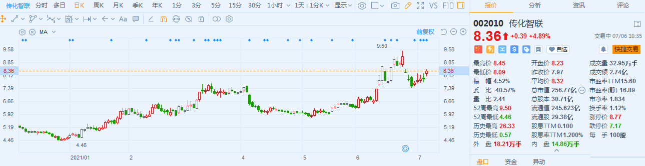 传化智联(002010.SZ)股价高位盘整,现报8.36元,涨幅4.89%,最新总市值256.8亿。