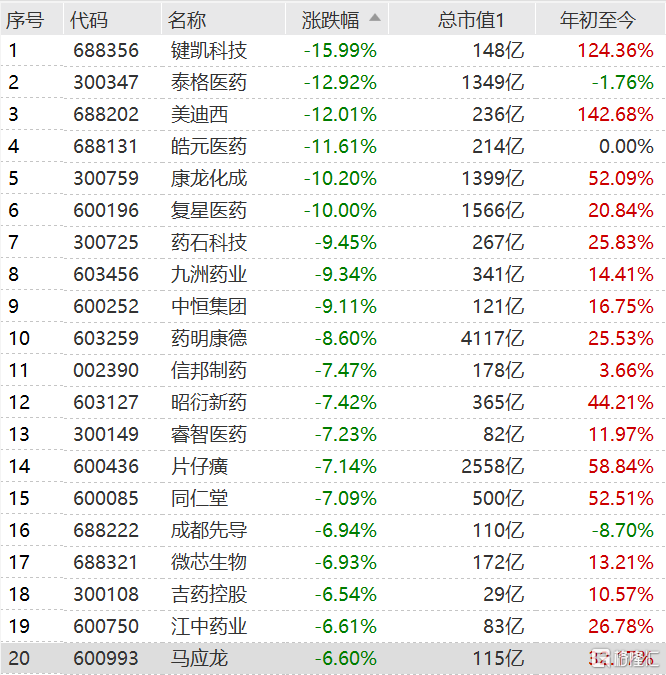 A两市医药股全线暴跌,A股复星医药跌停,泰格医药、美迪西、爱尔眼科、康龙化成等跌幅均超10%,港股药明生物、复星医药、泰格医药、锦欣生殖、昭衍新药等均跌超10%。