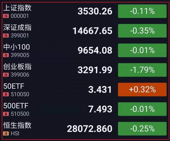 1.A股三大指数开盘涨跌不一。盘中,指数震荡走弱,医美、医疗器械、中药等医药股全线重挫,白酒、餐饮、食品加工等消费板块回调;氟化工、水泥、化工新材料、有机硅等化工股集体爆发,银行、证券等金融股拉升护盘,碳中和、电力、机场航运、盐湖提锂概念表现活跃。午后,指数下探回升,创指一度跌逾3%,光刻胶、第三代半导体等芯片概念股跳水,农林牧渔板块短线走高。总体来看,资金避险情绪仍旧明显,两市逾2500个股下跌。截至收盘,上证指数跌0.11%,报3530.26点,深证成指跌0.35%,报14667.65点,创业板指跌1.79%,报3291.99点;