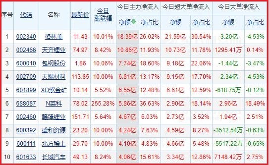 今日沪深两市主力资金净流入排名前5的个股分别为:格林美、天齐锂业、包钢股份、天赐材料、XD紫金矿;主力资金净流出排名前5的个股分别为:中远海控、比亚迪、歌尔股份、酒鬼酒、科大讯飞。