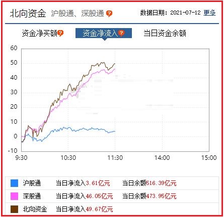截至午间收盘: 北向资金净流入49.67亿元,其中沪股通资金净流入3.61亿元,深股通资金净流入46.05亿元。