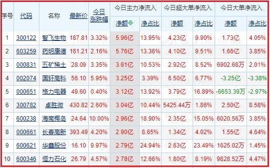 今日沪深两市主力资金净流入排名前5的个股分别为:智飞生物、药明康德、五矿稀土、国轩高科、格力电器;主力资金净流出排名前5的个股分别为:比亚迪、三峡能源、天齐锂业、包钢股份、中国平安。
