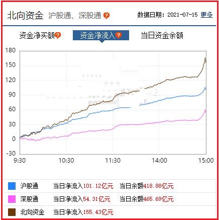 截至收盘: 北向资金净流入155.43亿元,其中沪股通资金净流入101.12亿元,深股通资金净流入54.31亿元。