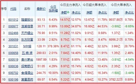 今日沪深两市主力资金净流入排名前5的个股分别为:隆基股份、浪潮信息、天齐锂业、东方财富、N中熔;主力资金净流出排名前5的个股分别为:比亚迪、京东方A、中远海控、三峡能源、TCL科技。