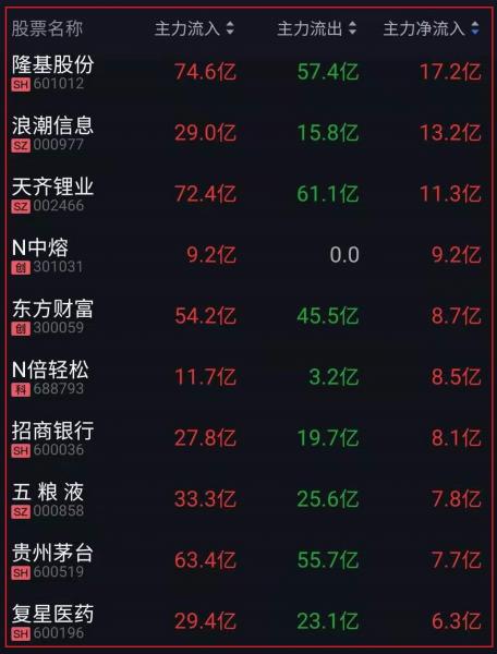 资金净流入十大人气热股: