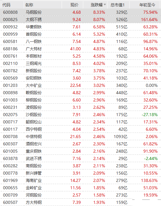 钢铁板块今日持续强势,马钢股份、太钢不锈双双涨超8%,华菱钢铁涨超6%,首钢股份、广大特材、八一钢铁等跟涨。港股方面,马鞍山钢铁股份涨超5%,重庆钢铁股份涨超4%,鞍钢股份涨超3%。