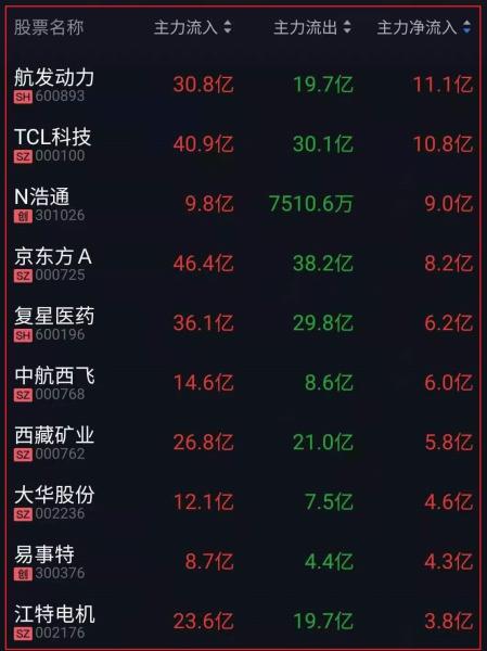 资金净流入十大人气热股: