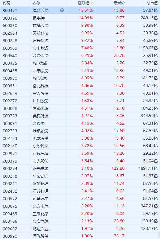 氢能板块走强,厚普股份大涨超15%,易事特涨超14%,富瑞特装涨超9%,宝丰能源、深冷股份、美锦能源、雄韬股份、雪人股份等跟涨。根据国资委发布的信息,目前超过三分之一的中央企业已经在制定包括制氢、储氢、加氢、用氢等全产业链布局,取得了一批技术研发和示范应用成果。央企对氢能产业的参与充分体现了碳中和目标下氢能赛道的发展前景。