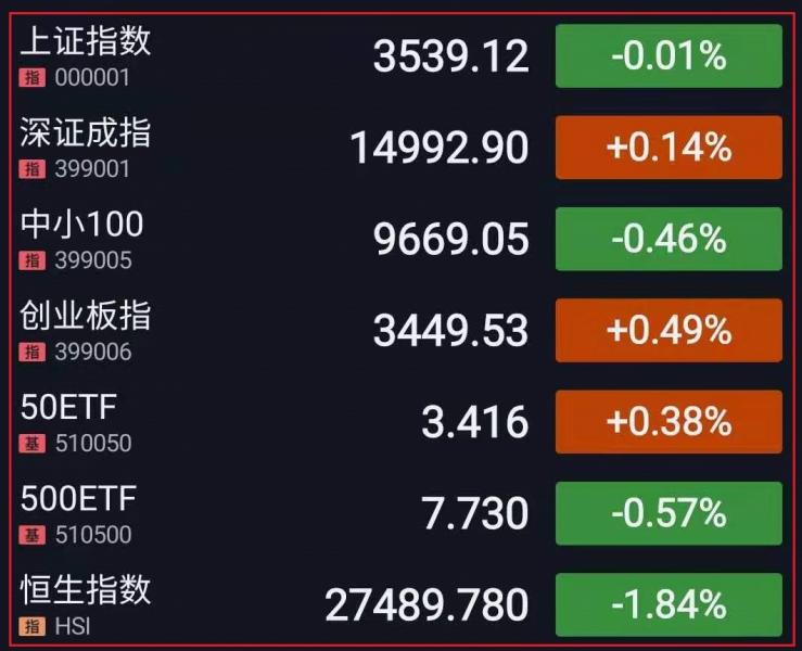 1.A股三大指数开盘涨跌不一。随后指数走势分化,HIT电池、氢能源、储能概念强势上涨;上海自贸区、造纸、猪肉股持续回调。盘中指数集体下挫,中药、稀土板块表现活跃,煤炭、医美、白酒股拉升回暖,油服、食品加工、REITS概念表现低迷。午后,指数宽幅震荡,大豆、玉米、转基因等农业股全线爆发,机场航运、通信设备、网络安全短线走高;盐湖提锂、鸿蒙概念重挫。总体来看,市场情绪仍偏向谨慎,两市逾2500个股下跌,成交额连续第13个交易日突破1万亿元。截至收盘,沪指跌0.01%,报收3539点;深成指涨0.14%,报收14992点;创业板指涨0.49%,报收3449点;