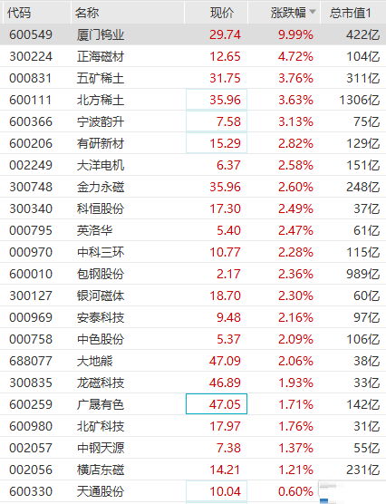 稀土永磁板块异动拉升,厦门钨业强势封板,正海磁材涨超4%,五矿稀土、北方稀土、宁波韵升等集体走强。今日,稀土价格继续上行,市场情绪积极,商家热情不减,报价持续上探,镨钕市场现货紧张,出货谨慎,成交价格居高,氧化镨钕报价59-60万元/吨,金属镨钕72-75万元/吨,价格快速上涨阶段,商家观望居多,部分企业暂不报价,整体市场报价略显混乱。镝铽价格稳中上调,受缅甸矿进口影响,国内中重稀土产品价格上涨,氧化镝报价255万元/吨及以上,氧化铽报价720-730万元/吨,按需成交为主,钆钬因现货不好买,成交价格高位上行,预计近期稀土价格仍有上涨趋势。