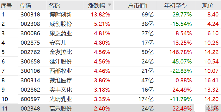 博晖创新涨近14%,威创股份涨超5%,康芝药业、安奈儿、金发拉比、延江股份和西部牧业涨超4%,戴维医疗、光明乳业涨超3%。