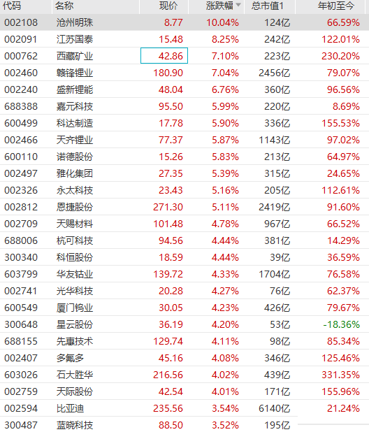 锂电池板块再度走强,沧州明珠涨停,江苏国泰涨超8%,赣锋锂业涨超7%再创历史新高,盛新锂能涨超6%,天齐锂业、雅化集团、恩捷股份、天赐材料等跟涨。天风证券研报指出,2021年多家下游锂电企业均进行了大规模的扩产,锂电设备戴维斯双击有望即将来临。由于锂电设备普遍产能紧张,终端订单逐步扩散至二线厂商。据统计,2021年锂电设备主流厂商获取订单近450亿,其中锂电业务订单达到了348亿左右,分别为其2020年收入的2.98倍、2.31倍,锂电设备转入卖方市场,供需非常紧张。