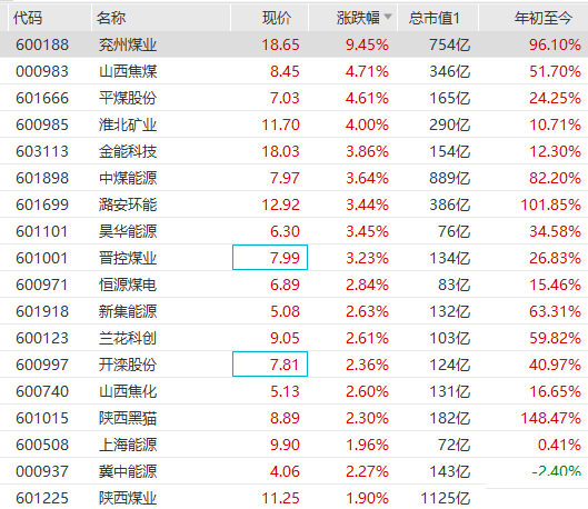 煤炭板块拉升,兖州煤业涨超9%,山西焦煤、平煤股份、中煤能源等跟涨。随着夏季用电高峰的到来,近期动力煤等现货价格均在高位徘徊,期货价格也水涨船高。机构观点表示,从基本面来看,因煤矿事故所带来的安监停产使得供给端再度发酵,旺季保供难度大增。国泰君安分析师翟堃表示,煤炭行业正在迎来供给侧改革与碳中和的推动,产能进入向下周期,供需缺口抬高煤价中枢,远期盈利高位震荡。板块估值仍处于近五年低位、近十年20%分位。基于资源品高盈利弹性,看好中报行情。