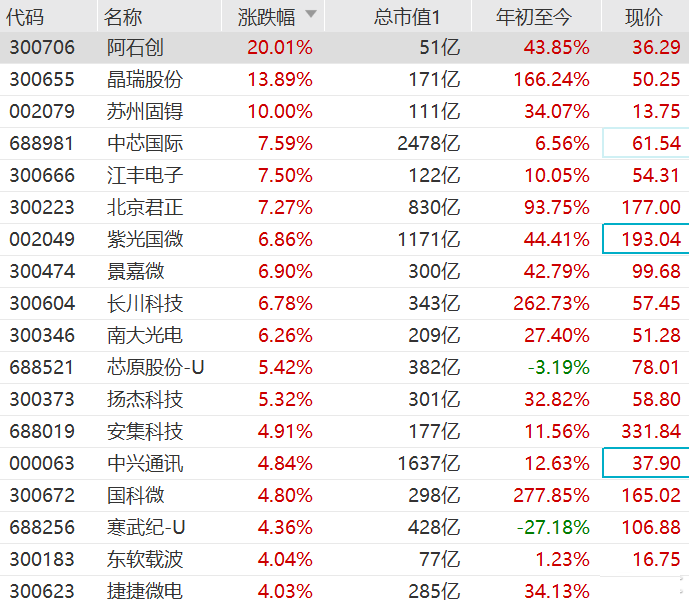 港A两地半导体股今日继续活跃,A股市场阿石创涨20%涨停,晶瑞股份涨近14%,苏州固锝涨10%涨停,中芯国际、江丰电子、北京君正涨超7%,紫光国微、景嘉微、长川科技、和南大光电涨超6%;港股华虹半导体涨8%,中芯国际涨超7%,上海复旦和晶门半导体涨超6%。