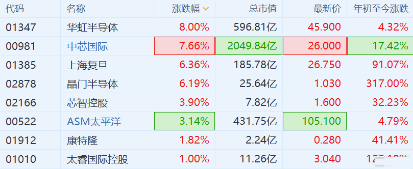 【盘面实况】半导体板块活跃 中芯国际AH股均拉升涨超7%