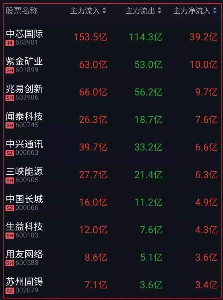 资金净流入十大人气热股:
