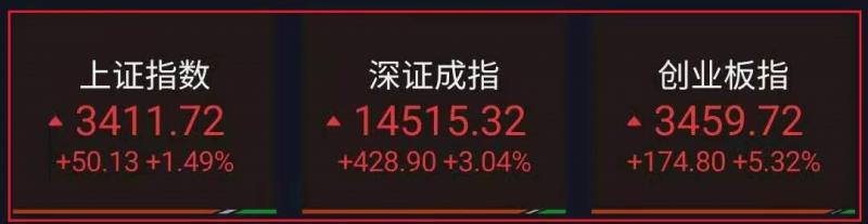 盘面上,光刻胶、HIT电池、储能、MCU芯片、第三代半导体涨幅居前,酒店及餐饮、银行、白酒概念下跌前列。截至收盘,沪指涨1.49%,报收3411点;深成指涨3.04%,报收14515点;创业板指涨5.32%,报收3459点