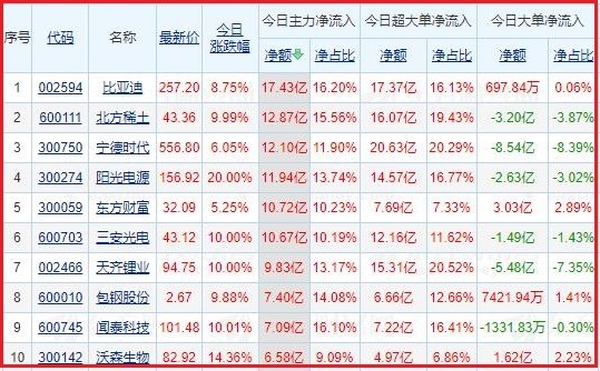 今日沪深两市主力资金净流入排名前5的个股分别为:比亚迪、北方稀土、宁德时代、阳光电源、东方财富;主力资金净流出排名前5的个股分别为:贵州茅台、舍得酒业、泸州老窖、润和软件、五 粮 液。