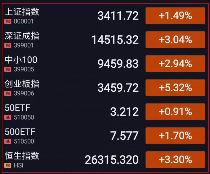 1.三大指数高开,开盘后创指涨逾3%,光伏、BIPV板块全线走高,锂电池板块走强,前期热点银行、白酒板块回调。随后三大指数高位震荡,创业板指涨幅领先,深强沪弱格局较为明显,科技股集体反弹,半导体芯片股走高,光刻胶板块大幅拉升。午后三大指数高位震荡,沪指涨逾1%重回3400点,创指午后涨幅扩大至5%,宁德时代(556.800 31.75 6.05%)、阳光电源(156.920 26.15 20.00%)等权重股涨幅较大,锂电板块掀涨停潮,光刻胶板块延续强势,沪深两市成交额再超万亿,总体而言,多头发力,板块、个股普涨,赚钱效应极好。截至收盘,上证指数涨1.49%,报3411.72点,深证成指涨3.04%,报14515.32点,创业板指涨5.32%,报3459.72点;