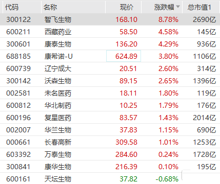 疫苗板块拉升走高,智飞生物大涨超8%,西藏药业、康泰生物涨超4%,康希诺涨近4%,沃森生物、未名医药、复星医药等纷纷跟涨。两大药企突然上调疫苗价格,辉瑞向欧盟提供的新冠疫苗最新价格为19.50欧元,比之前的15.50欧元上调了四分之一以上,而莫德纳的疫苗单价则为25.50美元,比首次采购的合同单价(22.60美元)高出大约十分之一。辉瑞上周将疫苗年度收入预期上调了近三分之一,两家公司今年有望实现数百亿美元的收入。