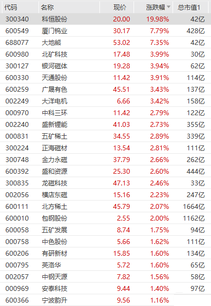 稀土永磁板块拉升走强,科恒股份涨停,大地熊、厦门钨业涨超7%,北矿科技、银河磁体、广晟有色等跟涨。日前,南方稀土公布了最新中重稀土氧化物挂牌价,部分稀土氧化物价格有所上调。氧化钆挂牌均价上调1万元/吨,氧化铽挂牌均价上调110万元/吨,氧化镝挂牌均价上调10万元/吨,氧化钬挂牌均价上调6万元/吨,氧化铒挂牌均价上调0.5万元/吨,氧化镱挂牌均价上调1.5万元/吨、氧化钇挂牌均价上调0.3万元/吨。