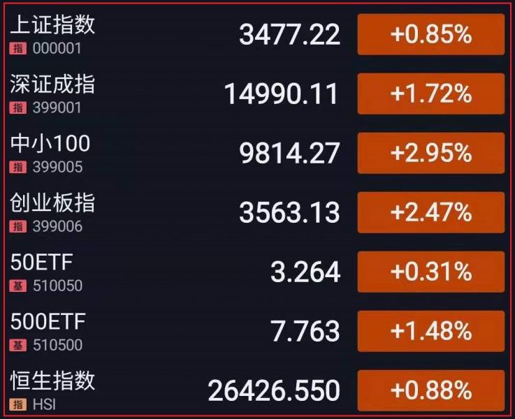 1.A股三大指数全线低开。盘中指数冲高震荡,体育产业,新能源汽车、储能板块集体走强,LED、半导体、MCU芯片等活跃,稀土、军工股先后冲高;抗疫概念股大幅回调,医药、养殖、通信板块下挫走弱。午后指数再度上扬,锂电池概念上演涨停潮,煤炭、钢铁等资源类周期股再度爆发;餐饮、旅游、乳业等大消费板块持续低迷。个股方面,比亚迪(308.090 28.01 10.00%)尾盘涨停股价刷新历史新高。总体来看,市场情绪逐步回暖,高景气赛道强势回归,两市逾2600个股上涨,成交额超1.2万亿元。截至收盘,上证指数涨0.85%,报3477.22点,深证成指涨1.72%,报14990.11点,创业板指涨2.47%,报3563.13点;