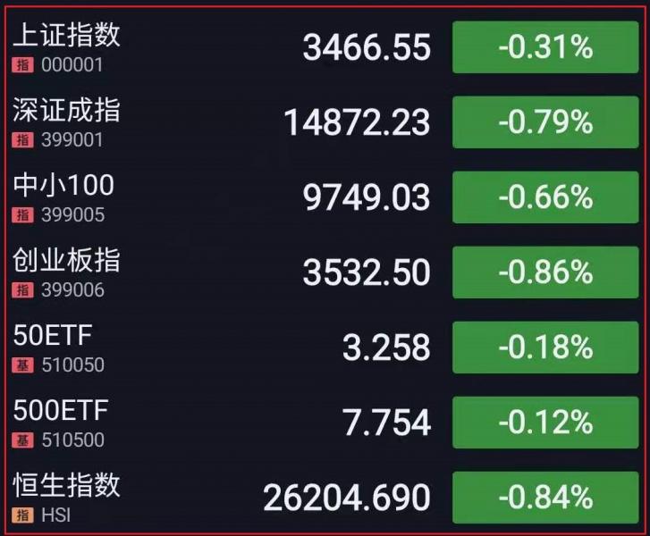 1.A股三大指数全线低开。盘中指数震荡盘整,创指一度跌逾1%,卫星、飞机、船舶等大军工板块全线爆发,地产、消费电子、CRO、中药板块活跃;磷化工、有机硅、可降解塑料等化工股遭重挫,云游戏、鸿蒙概念、国产软件表现低迷。午后指数再度下行,抗疫概念股大幅走弱,白酒、医美等消费板块回调;农业、汽车、钢铁板块先后拉升。总体来看,大盘仍处于震荡修复阶段,市场情绪较为低迷,两市逾3000个股下跌。截至收盘,上证指数跌0.31%,报3466.55点,深证成指跌0.79%,报14872.23点,创业板指跌0.86%,报3532.50点;