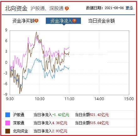 截至午间收盘: 北向资金净流入2.93亿元,其中沪股通资金净流出1.42亿元,深股通资金净流入4.36亿元。
