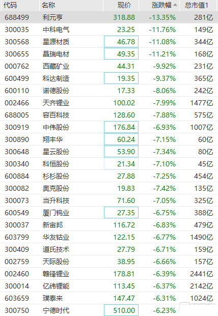 锂电板块大幅走低,利元亨、中科电气、星源材质等多股跌超10%,天齐锂业跌近8%,中伟股份跌近7%,华友钴业、亿纬锂能、赣锋锂业、宁德时代跌等超6%。昨日中信证券发文表示,本周二盐湖股份重新上市,新能源板块内部存在较大分流压力。