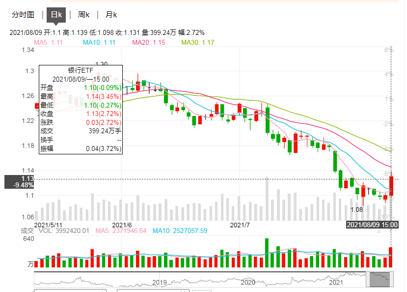 8月9日银行股集体反弹,截止收盘,宁波银行大涨7.45%,平安银行均大涨6.72%,杭州银行涨超5.43%,兴业银行、招商银行、南京银行、江苏银行等个股均走高,银行ETF涨幅2.72%。