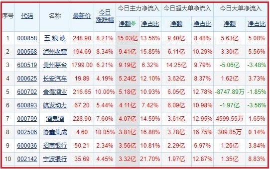 今日沪深两市主力资金净流入排名前5的个股分别为:五 粮 液、泸州老窖、贵州茅台、长安汽车、舍得酒业;主力资金净流出排名前5的个股分别为:盐湖股份、隆基股份、天齐锂业、中芯国际、比亚迪。