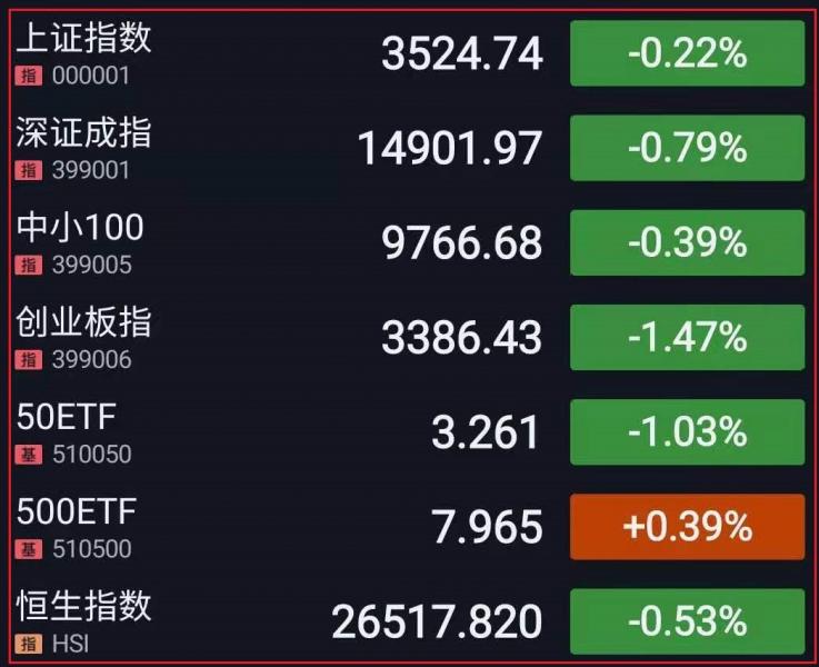 1.三大指数低开后低位震荡,科创50在芯片、汽车板块带领下一枝独秀红盘整理,随后创指带领深成指下挫先后跌逾1%,尾盘指数略有回暖。板块方面,市场风格继续切换,前期热点军工板块走弱,半导体、汽车、网安板块拉升。午后三大指数横盘整理,成交额再破万亿。盘尾北向资金加速流入。板块方面,盐湖提锂板块持续拉升,白酒板块走弱。总体而言,市场情绪较冷,个股涨跌参半,赚钱效应一般。截至收盘,沪指跌0.22%,报3524.74点,成交额达5382亿元;深成指跌0.79%,报14901.97点,成交额达7667亿元;创指跌1.47%,报3386.43点,成交额达3176亿元;