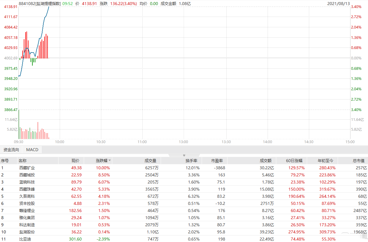 盐湖提锂板块异动拉升 ,西藏矿业封涨停,西藏城投涨超8%,蓝晓科技涨超6%,久吾高科、贤丰控股、赣锋锂业等跟涨;