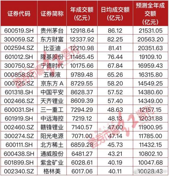 从日均成交金额来看,五粮液、京东方A等多数公司均超过40亿元,若以上述公司目前的日均成交额测算,除了已经达到万亿成交的贵州茅台等公司,五粮液、京东方A、天齐锂业、赣锋锂业等12家公司均有望在今年实现万亿成交。