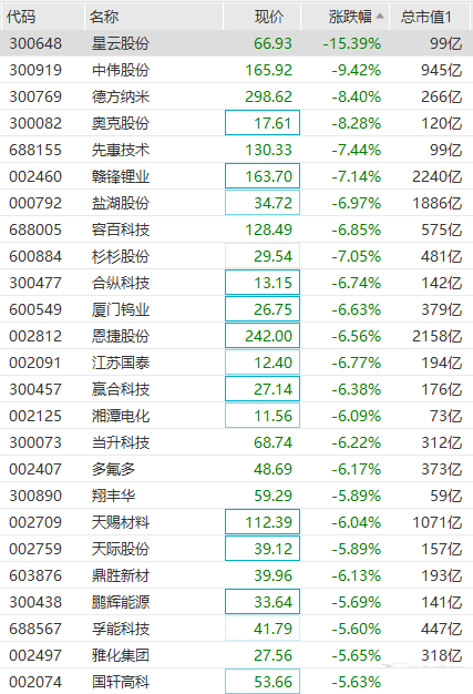 锂电产业链集体回撤,宁德时代跌超3%,中微股份跌超9%,赣锋锂业跌超7%,盐湖股份跌近7%,恩捷股份跌超6%