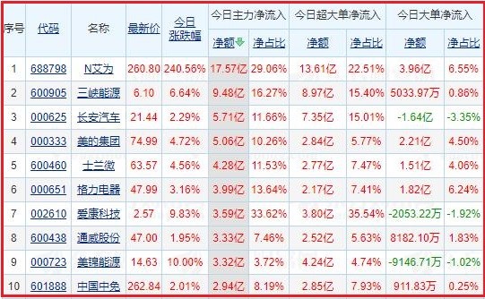 今日沪深两市主力资金净流入排名前5的个股分别为:N艾为、三峡能源、长安汽车、美的集团、士兰微;主力资金净流出排名前5的个股分别为:比亚迪、北方稀土、赣锋锂业、三一重工、中远海控。