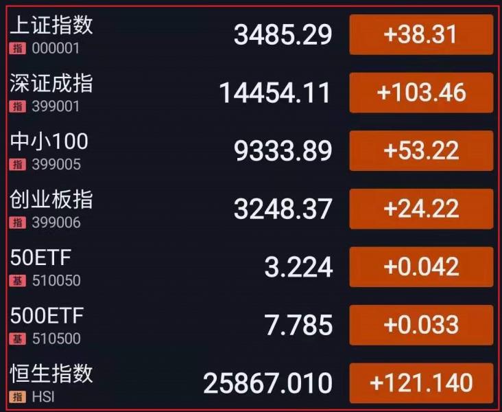 1.A股三大指数开盘涨跌不一。盘中指数震荡回暖,磷化工、有机硅等化工股持续走高,证券、银行等强势爆发,啤酒、水泥、盐湖提锂概念股活跃;食品、消费电子板块下挫走弱,第三代半导体、钠离子电池、猪肉、农业种植等板块表现低迷。午后指数横盘整理,大金融板块掀涨停潮,军工、数字货币等先后拉升;汽车、储能概念股持续回调。总体来看,多空博弈激烈,个股涨多跌少,赚钱效应较好。截至收盘,上证指数涨1.11%,报3485.29点,深证成指涨0.72%,报14454.11点,创业板指涨0.75%,报3248.37点;