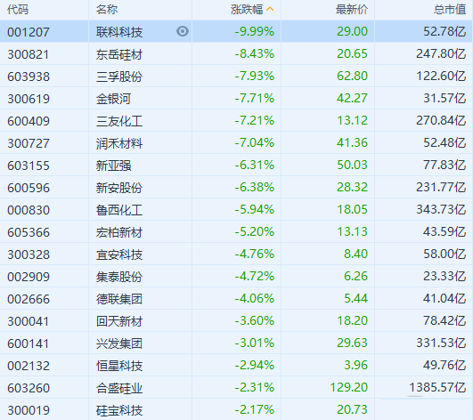 有机硅板块大幅走低,昨日20%涨停的东岳硅材盘中一度跌超10%,现跌超8%;三孚股份、金银河跌近8%,润禾材料、三友化工等跟跌。东岳硅材昨日公告,持股9.75%股东淄博晓希通过集中竞价、大宗交易减持不超过3%公司股份。硅料作为光伏产业的上游,今年以来价格持续上涨,多晶硅致密料从年初的每吨8万元一路涨到每吨21万,硅料企业纷纷大幅增产。