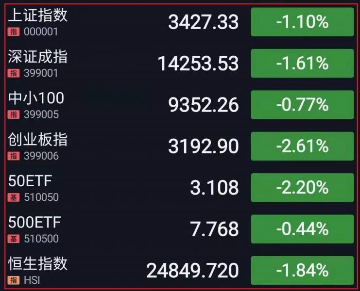1.A股三大指数集体低开,盘中震荡下行。水泥、钛、半导体芯片股拉升走高,磷化工、有机硅等化工股持续活跃;医药医疗、白酒、食品饮料等大消费板块持续下挫;大金融板块分化,券商股反复活跃、银行股持续走低。午后指数低位盘整,沪指一度失守3400点。稀土、钢铁板块大幅拉升,锂电池股回暖;医美、汽车板块低迷;盐湖提锂概念股尾盘拉升。总体来看,大盘仍在震荡修复,个股呈现普跌态势,赚钱效应较差。截至收盘,上证指数跌1.10%,报3427.33点,深证成指跌1.61%,报14253.53点,创业板指跌2.61%,报3192.90点;