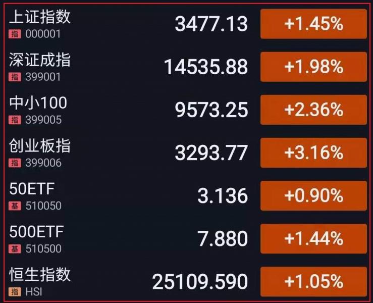 1.三大指数高开高走,先后涨逾1%,创指涨超2%,沪深两市成交额早盘突破8000亿。板块方面,煤炭、天然气、石油等资源股表现强势,大金融、房地产板块表现萎靡。午后三大指数延续上行态势,创指在盐湖提锂、医药等板块带动下大涨超3%,沪深两市成交额再破万亿,北向资金尾盘加速流入。板块方面,盐湖提锂、智能制造板块表现强势,证券板块延续萎靡。总体而言,板块个股普涨,赚钱效应较好。截至收盘,沪指涨1.45%,报3477.13点;深成指涨1.98%,报14535.88点;创指涨3.16%,报3293.77点;
