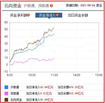 截至午间收盘: 北向资金净流入52.69亿元,其中沪股通资金净流入43.68亿元,深股通资金净流入9.01亿元。