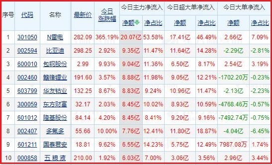 今日沪深两市主力资金净流入排名前5的个股分别为:N雷电、比亚迪、包钢股份、赣锋锂业、华友钴业;主力资金净流出排名前5的个股分别为:长安汽车、三一重工、京东方A、盐湖股份、创世纪。