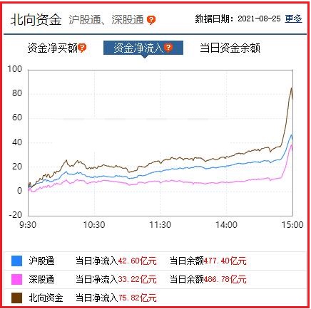 截至收盘: 北向资金净流入75.82亿元,其中沪股通资金净流入42.60亿元,深股通资金净流入33.22亿元。
